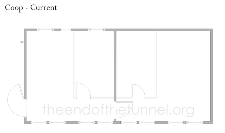 In addition to the basic cleanup of the building, the goal for the coop project is to make it able to hold a brooder in two weeks. As part of that, we want to do three main things: extend the interior coop wall to include the exterior chicken door, create removable roosting space, and build exterior-accessible nesting boxes.