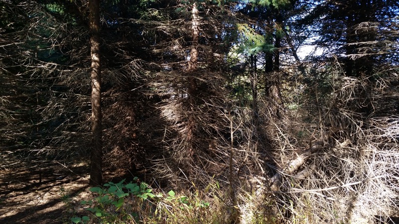 Normal pine tree stands are planted at about 400-500 trees per acre. This allows for them to grow straight and healthy. Stands like that can be used for lumber and wood pulp and can net a good amount of money when they mature. However, Christmas tree farms are planted at 1,000 – 1,500 trees per acre. This is no problem if trees are kept small and regularly trimmed… Unfortunatly, that’s no the case here. Our stand is dense. It’s dark in there. This level of density leads to really unhealthy trees, and from the research I’ve been doing, it appears that there is not much that can be done.